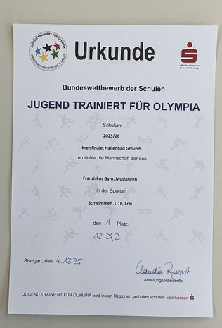 Das Franziskus Gymnasium kann mit Stolz verkünden, dass es in der Disziplin Schwimmen beim diesjährigen Wettbewerb „Jugend trainiert für Olympia“ einen herausragenden Erfolg erzielt hat. Mit einer talentierten Gruppe von zehn Schüler*innen trat die Schule in mehreren Staffeln und Lagen an und sicherte sich den ersten Platz.