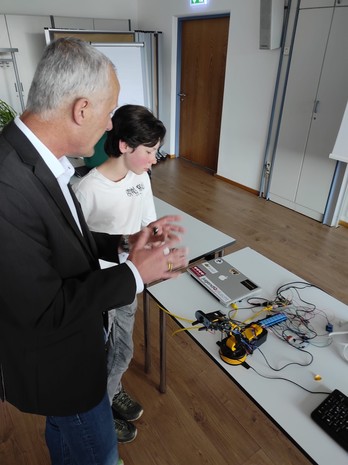 Gemeinsam mit Experten aus den unterschiedlichsten Fachbereichen der Firma Bosch war Paul an spannenden, innovativen Projekten beteiligt, wie z.B. am Umbau eines Roboterarms, der zu einem smarten Roboter mit Videokamera verwandelt wurde, welcher greifen und Bewegungen folgen konnte; genannt „RoboReach“. Dafür hatten Paul und „sein“ Bosch-Experte einen Tag Zeit. Am Samstagvormittag wurden die Projekte, bei denen Paul übrigens mit seinen 14 Jahren der jüngste Teilnehmer war, den interessierten Besuchern präsentiert und von einer unabhängigen Jury bewertet. Der Schüler des Franziskus Gymnasiums landete auf Platz 2. Die Jury war begeistert von dem Achtklässler, der für seine Altersklasse herausragende Erfahrungen im Programmieren und Mikroelektronik mitbrachte. Der BOGY-Beauftragte des Franziskus Gymnasiums, Waldemar Czapka, freute sich sehr über Paul Feys Erfolg. Jede Schule durfte nur einen Schüler für das Maker-Event bei der Firma Bosch vorschlagen. Dabei fiel seine Wahl auf Paul Fey, der letztlich auch durch sein technisches Know-How überzeugen konnte.