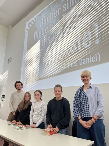 Drei Klassensieger traten gegeneinander an und lasen aus beliebten Büchern wie „Harry Potter und der Feuerkelch“, sowie aus den Abenteuern der „Drei !!!“ vor. Im Fremdtext galt es, aus „Der Wolf“ von Sascha Stanisic vorzulesen, das gleichzeitig auch das Buch war, das alle drei Teilnehmer*innen an diesen Vorlesewettbewerb erinnern soll. Die Vorträge waren sowohl spannend als auch mitreißend und sorgten für eine tolle Atmosphäre im Hörsaal.